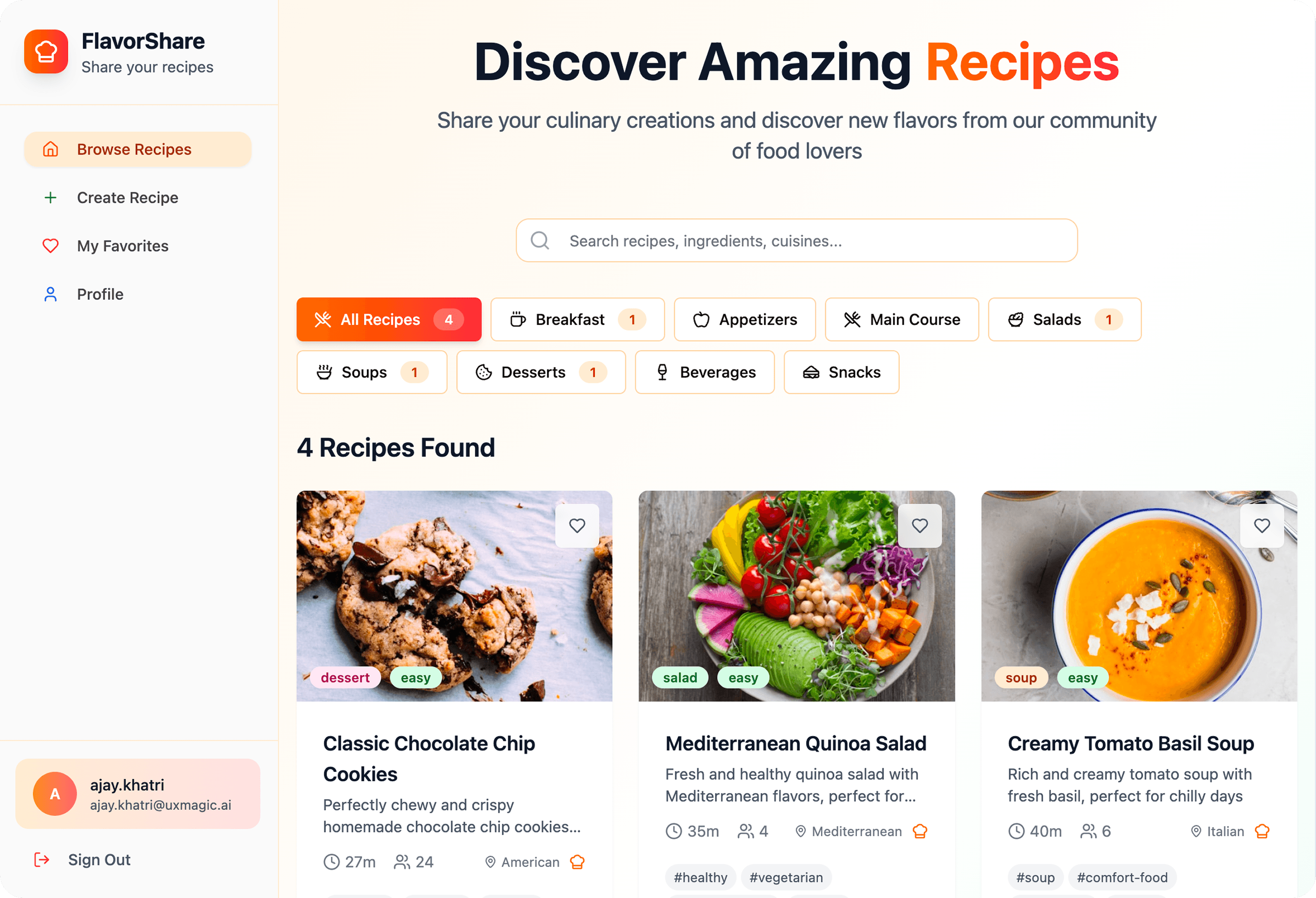 Interactive filter tags with recipe counts offer a superior browsing and feedback experience.