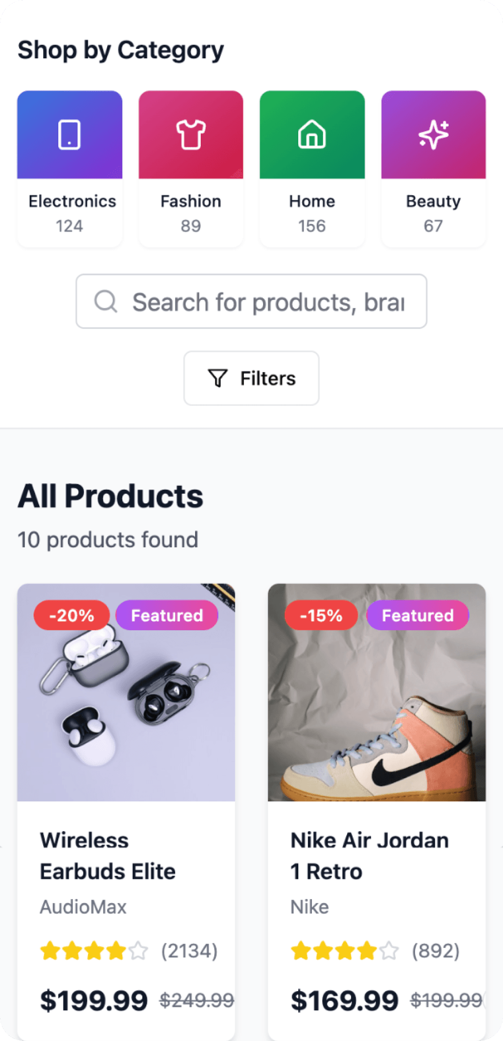 Product cards are information-rich, clearly showing discounts, ratings, and pricing.