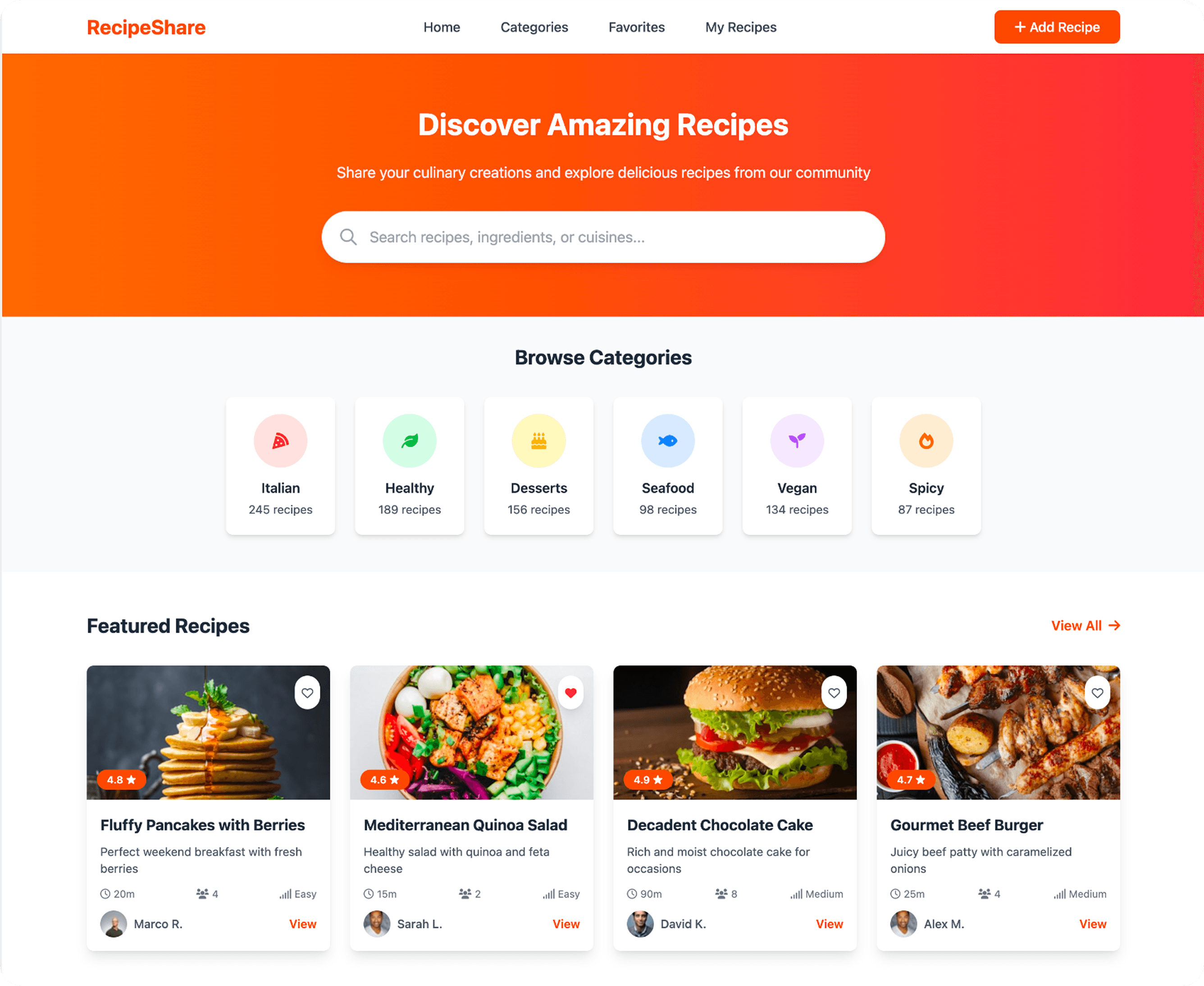 Recipe cards are information-rich, showing ratings, time, and servings at a glance.