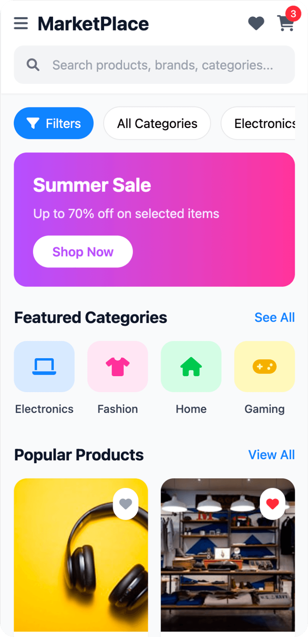 The structure, featuring a promo banner and curated sections, is ideal for an engaging home screen.