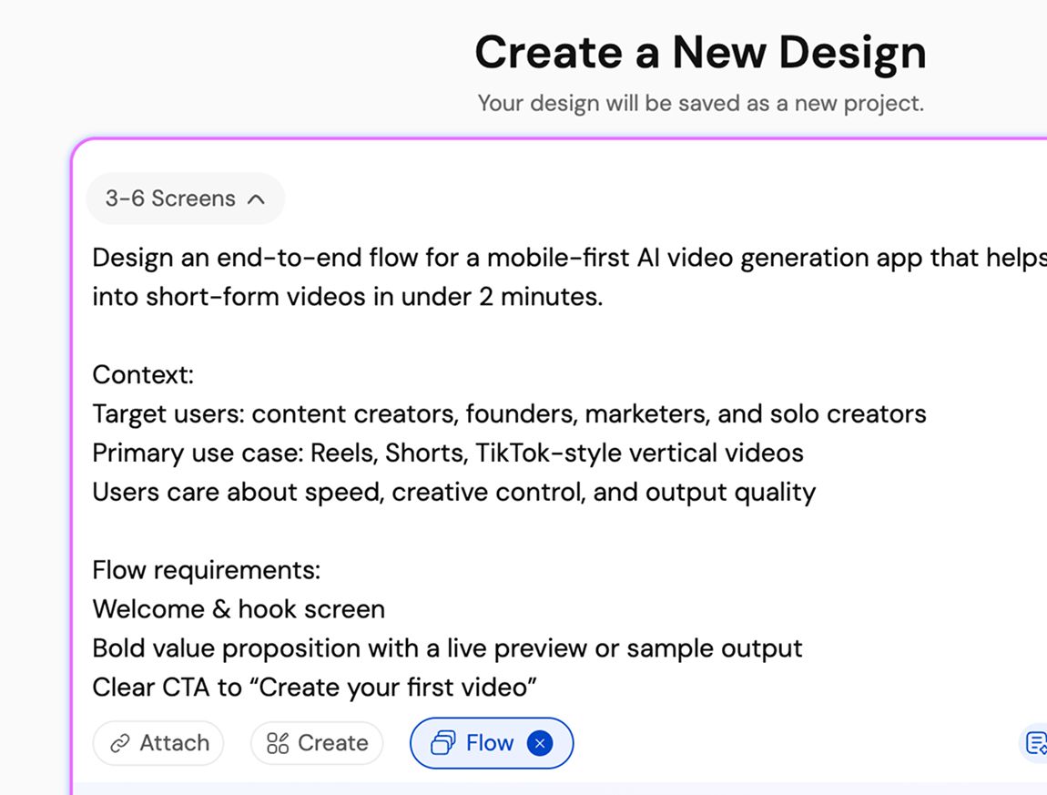 Flow Mode solves this by acting as an AI UI flow generator, allowing teams to design entire journeys instead of disconnected screens.