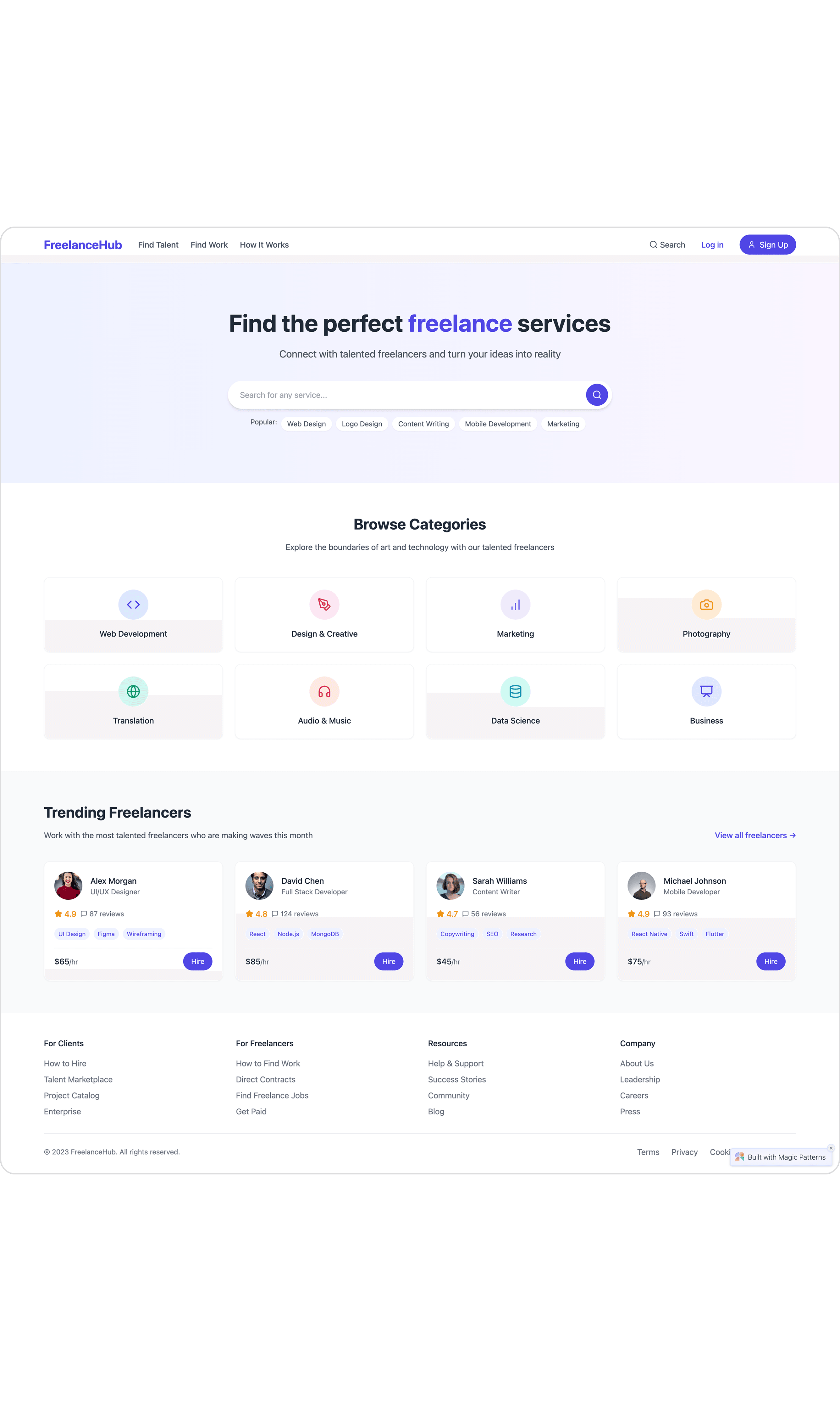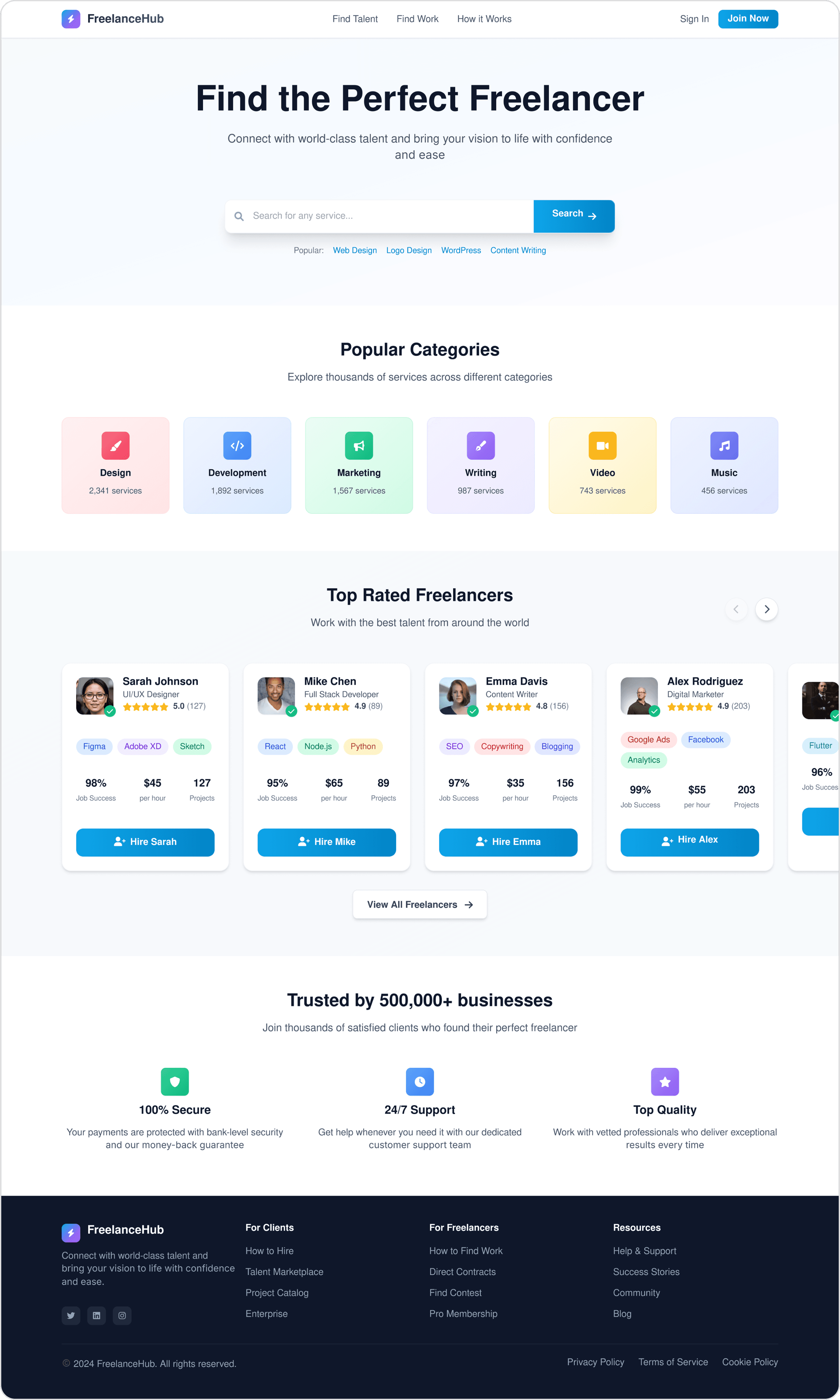 The headline, search bar, categories, and freelancer cards are well-structured, making it easy to scan.