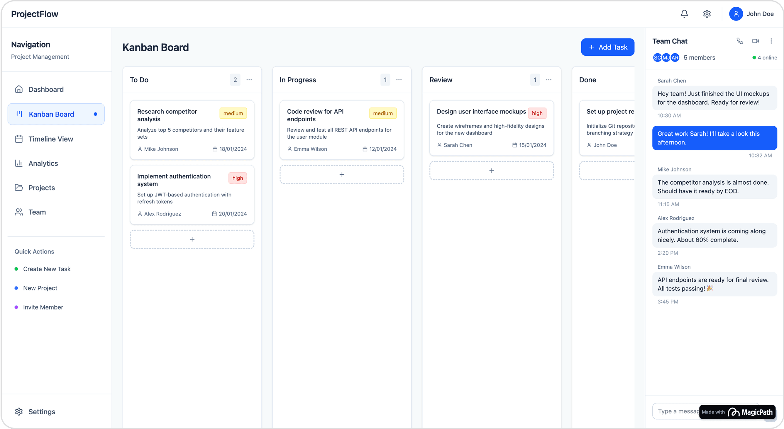 Side navigation with quick actions (create task/project/invite) makes workflow efficient.