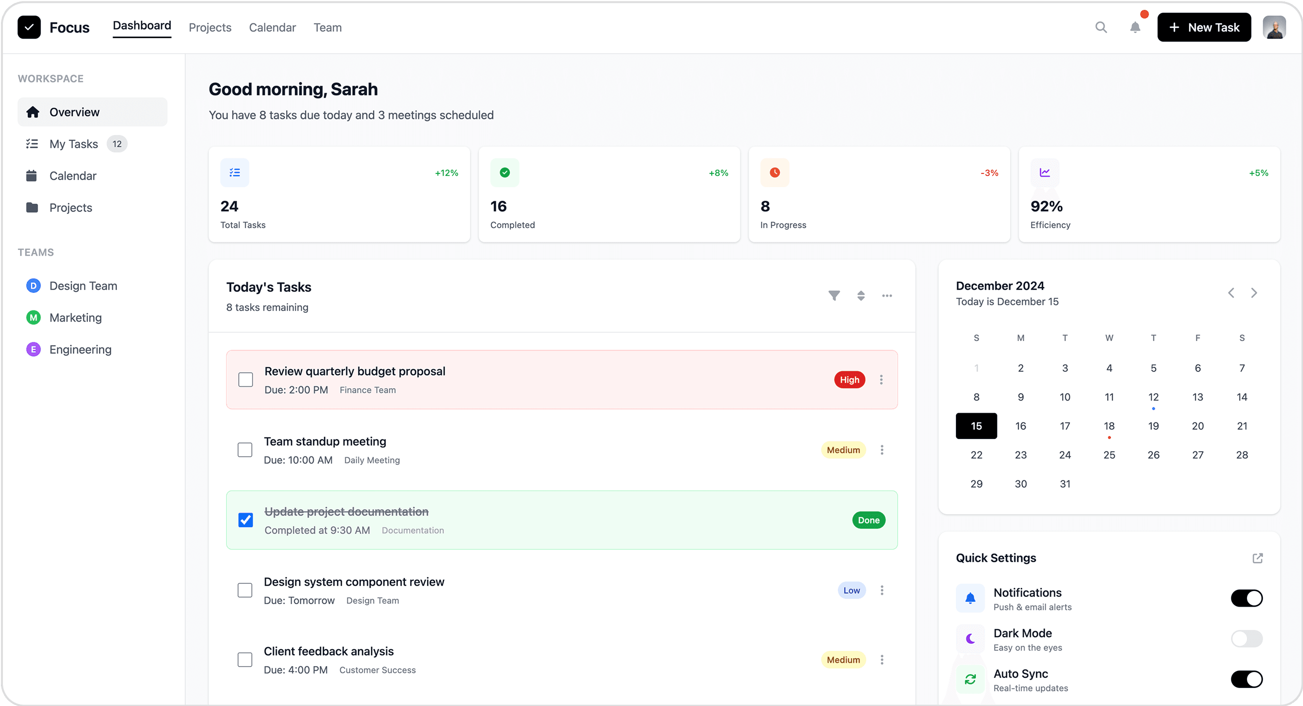 Dashboard gives a clear overview (tasks, progress, efficiency).