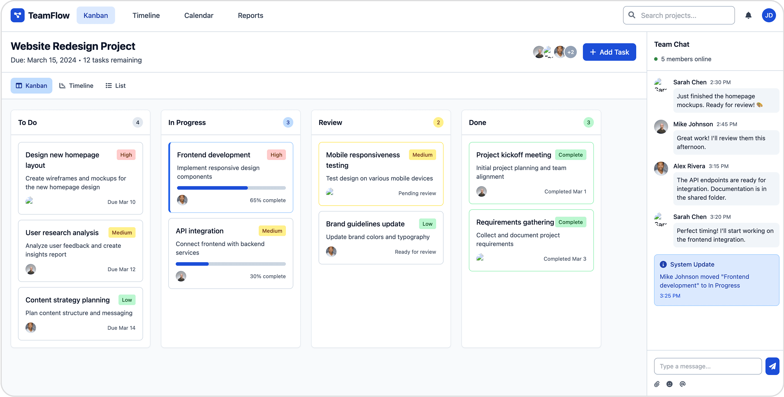 Task cards include progress bars, priorities, and due dates -> very informative at a glance.
