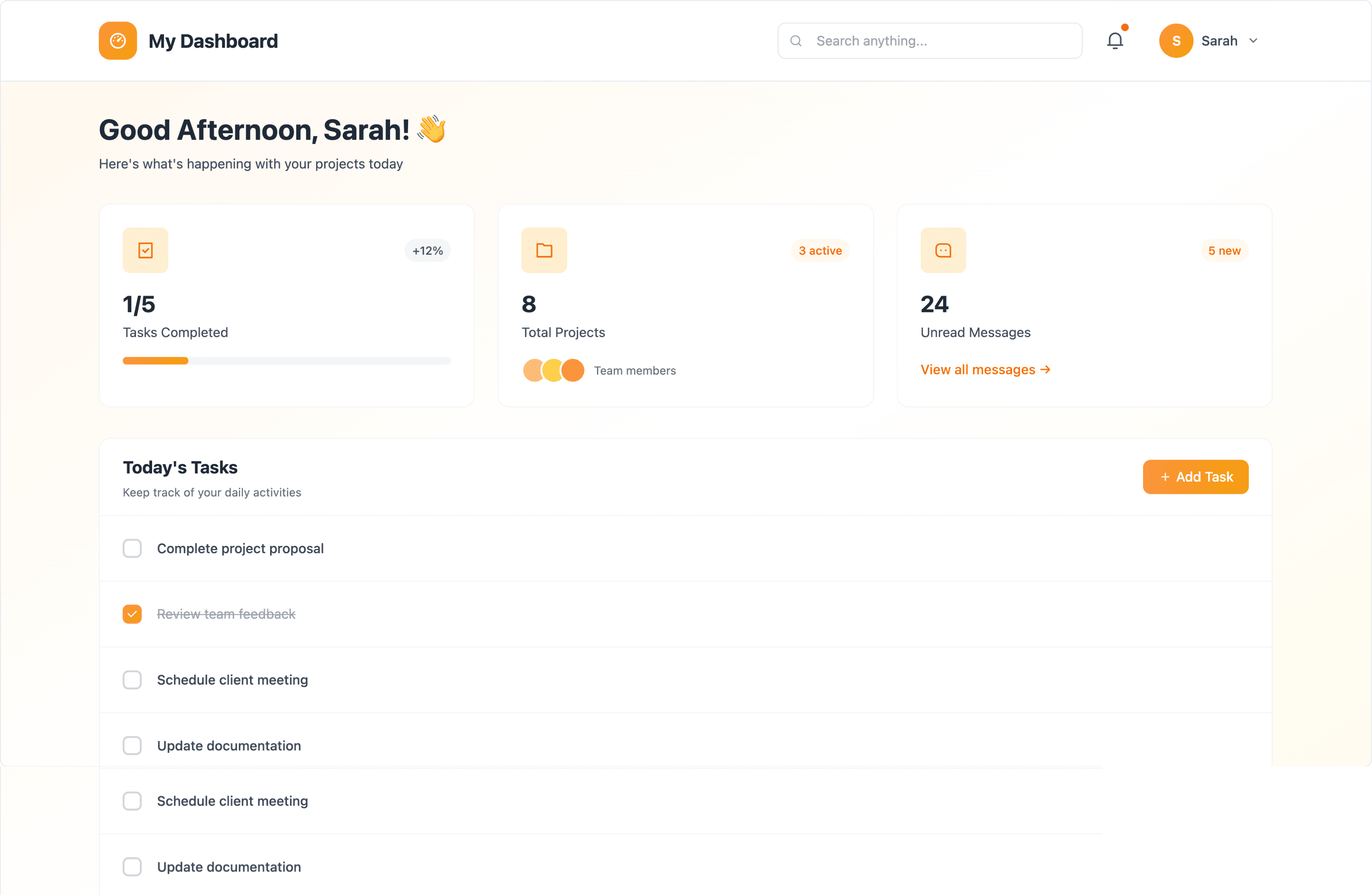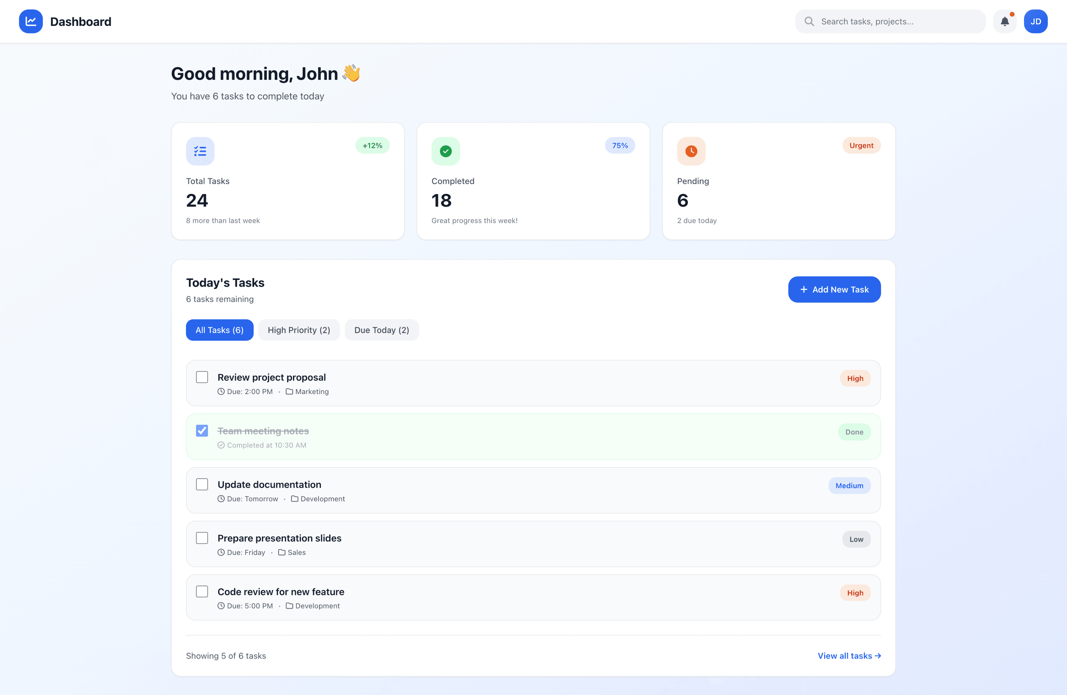 Strong structure & hierarchy — Greeting, widgets, and task list are well-organized with good spacing and visual clarity.