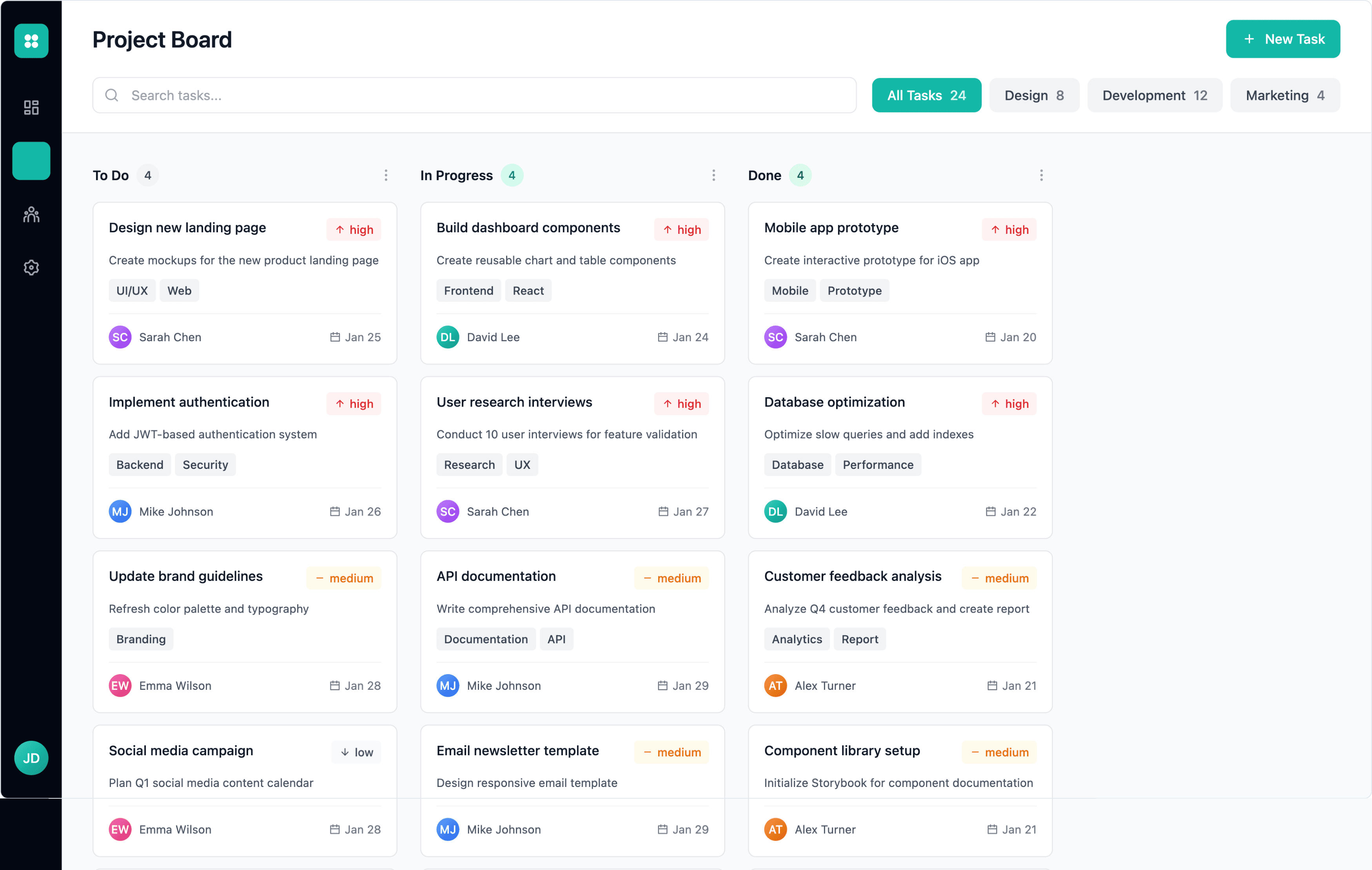 Strong hierarchy & usability cues — Avatars, tags, progress bars, and statuses are well balanced, making tasks feel interactive and draggable.