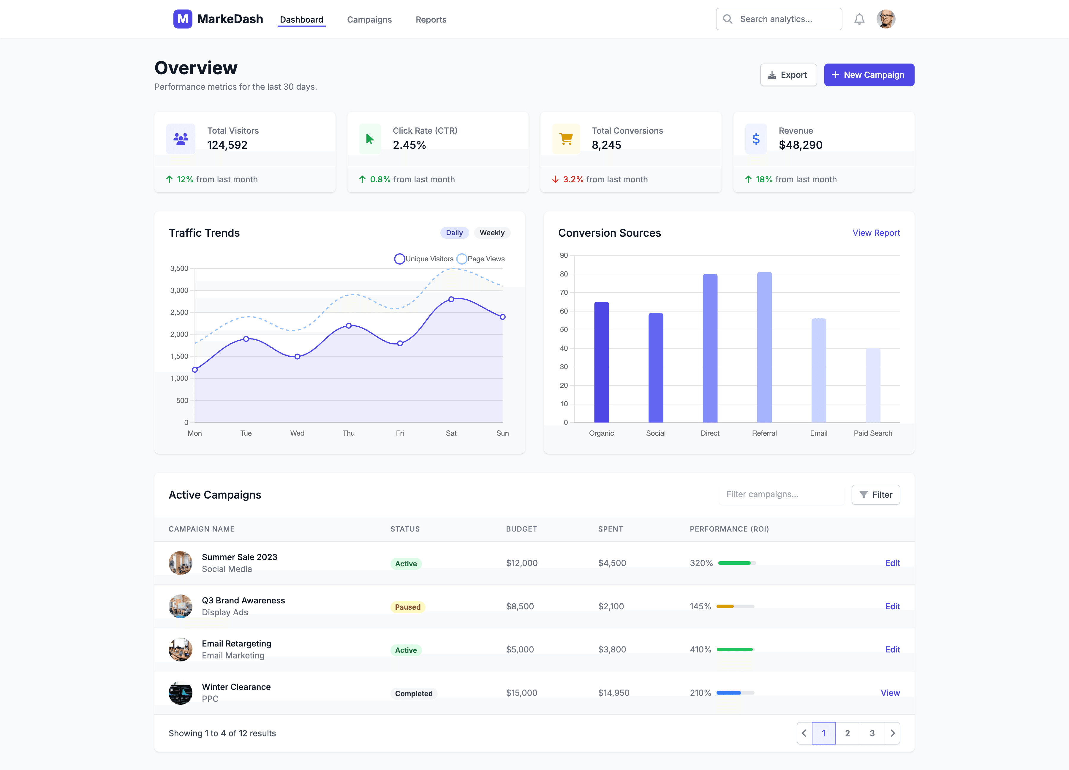 Strong visual hierarchy — Typography, card elevation, and color accents guide attention smoothly across key metrics and campaign insights.