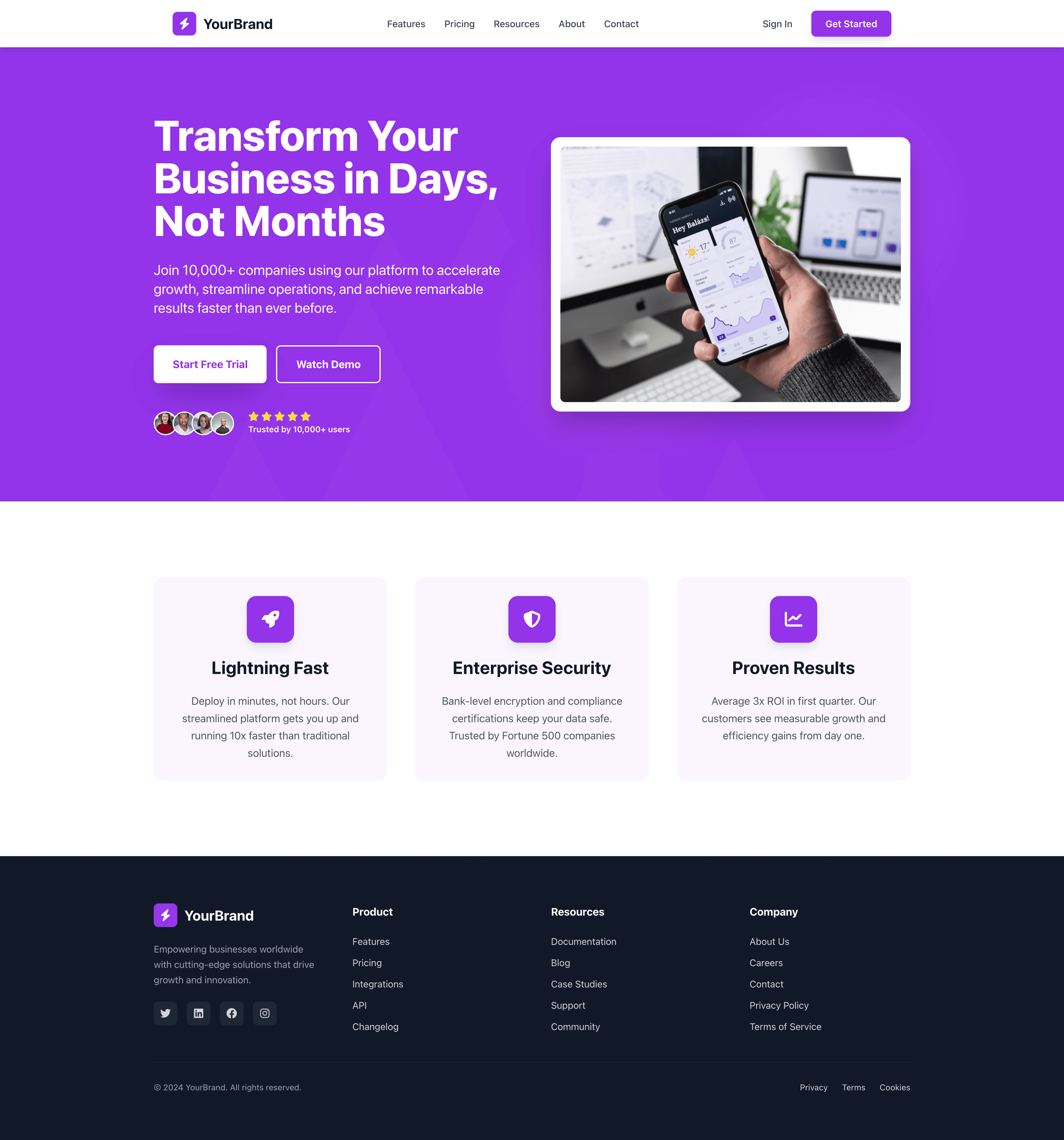 Hero color intensity is high — The saturated purple background reduces the “minimal, bright” feeling and can overshadow the product mockup.