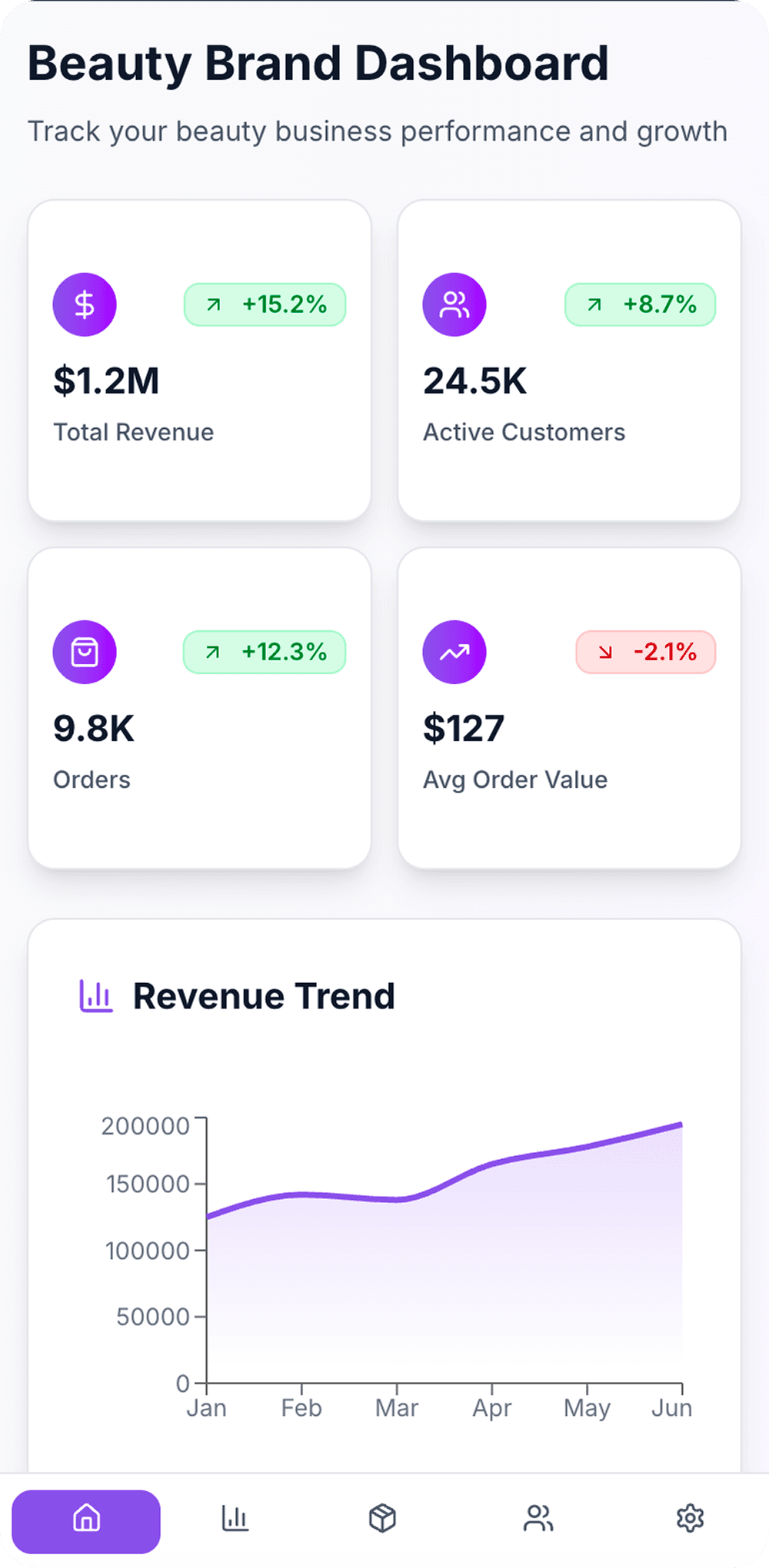 The revenue trend chart lacks crucial context, like a currency symbol or a clear title for the Y-axis.