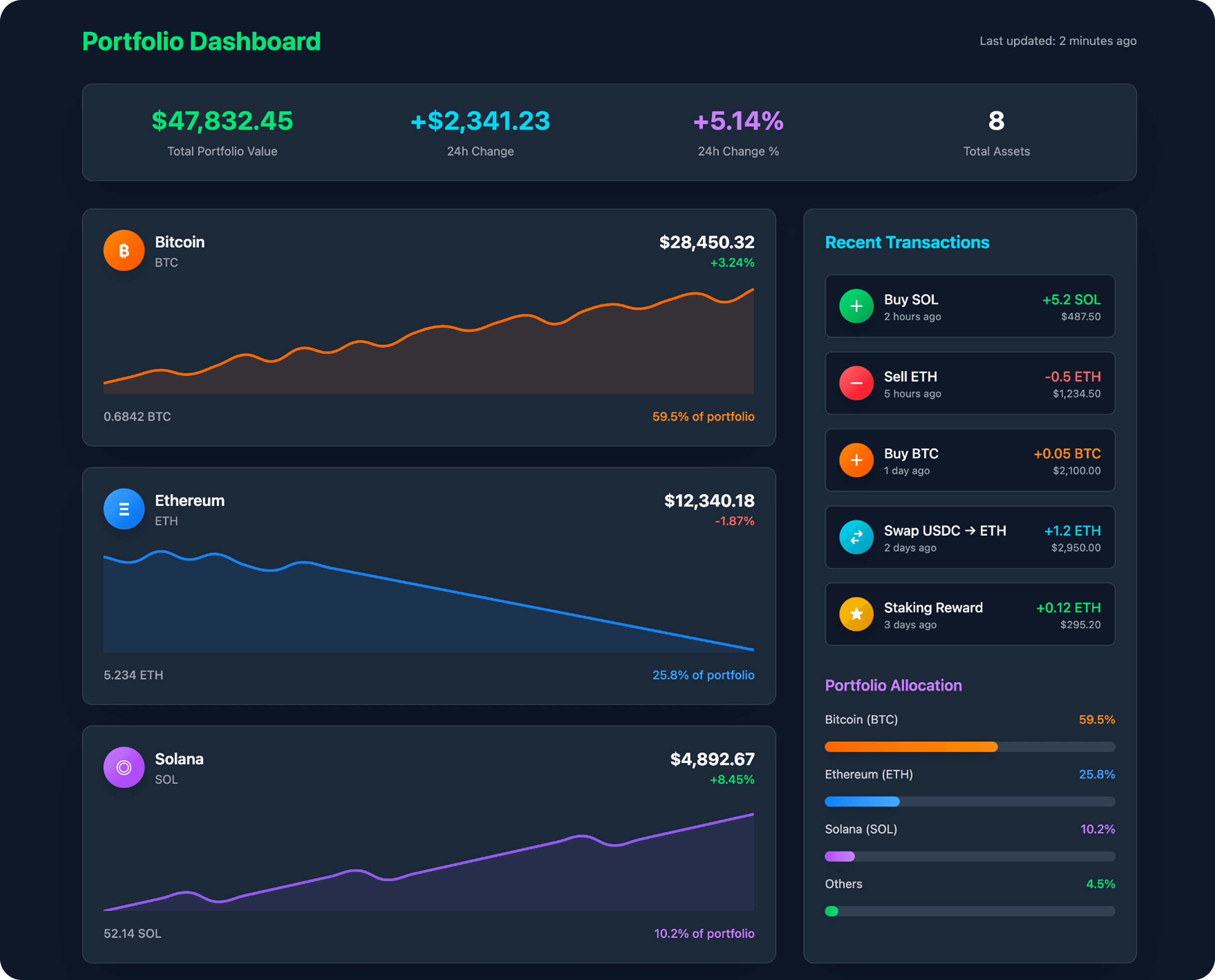 The layout effectively includes portfolio allocation and recent transactions without clutter.