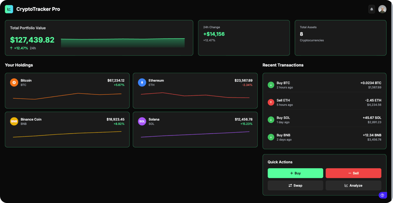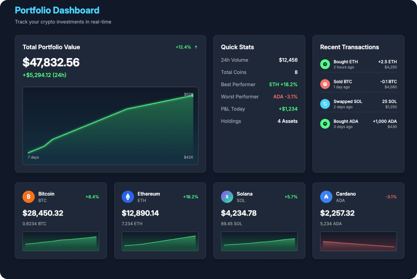 Covers all prompt elements: value, daily change, token charts, recent transactions, and quick actions.