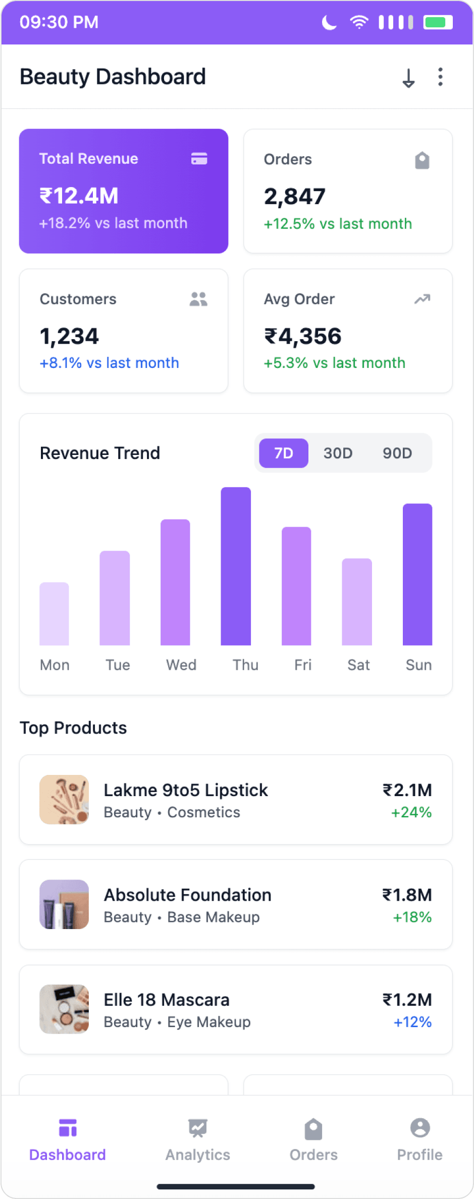 Strong visual hierarchy with clear grouping of KPIs, charts, and product insights.