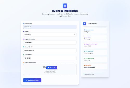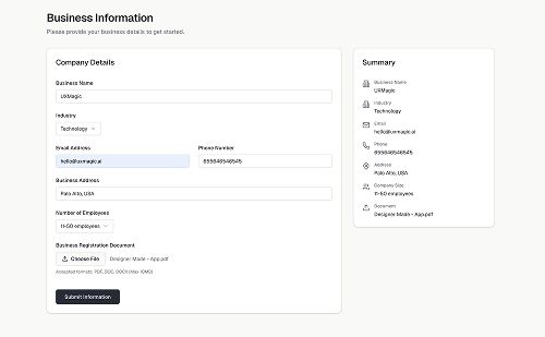 The right-side summary card is visually clear and mirrors enterprise onboarding patterns well.