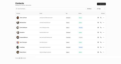 Tag and status styling lacks contrast, reducing quick-scan efficiency for CRM use cases.