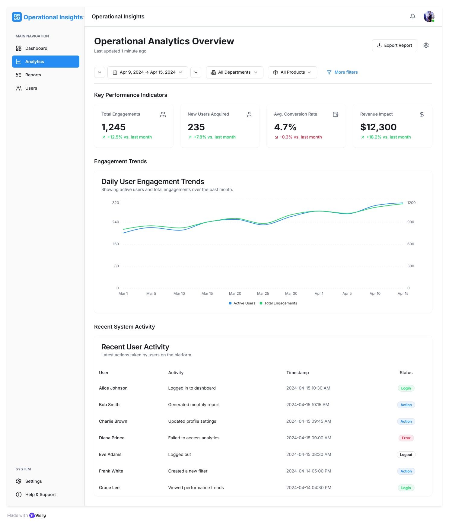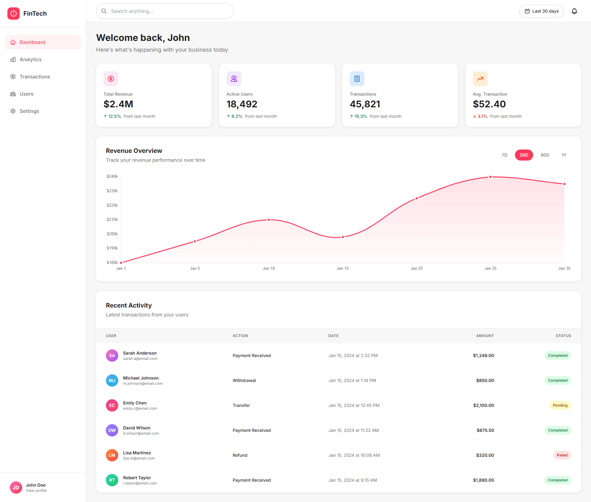 Very clean visual hierarchy – the KPI cards, graph, and recent activity are instantly scannable, which is perfect for first-time users.