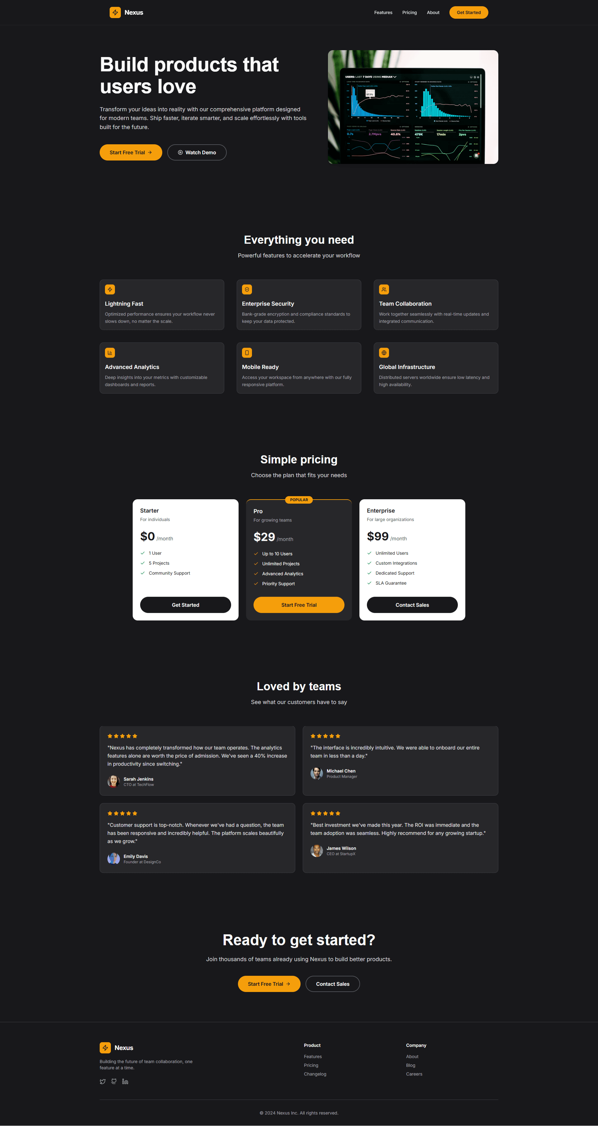 Strong visual impact and modern SaaS positioning – the dark theme with yellow accents feels premium and “AI-first”.