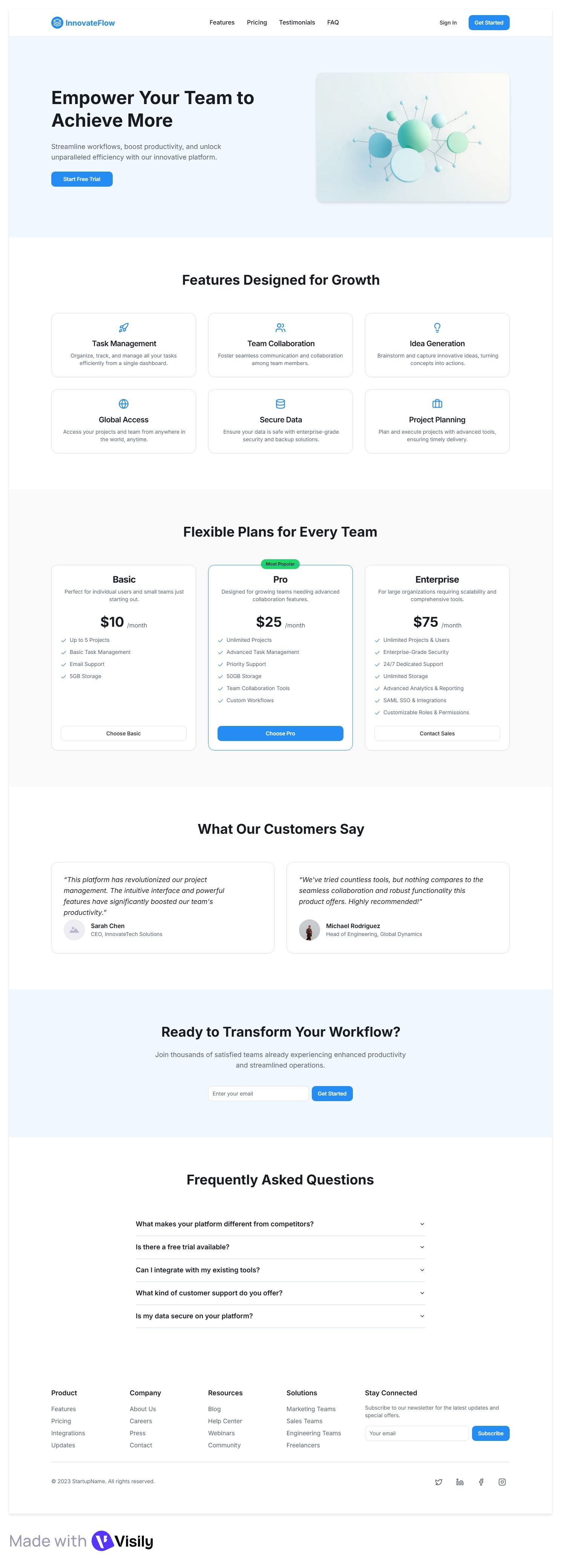 Very clear, beginner-friendly structure – hero → features → pricing → testimonials → FAQ → CTA. Perfect for non-technical or SMB audiences.